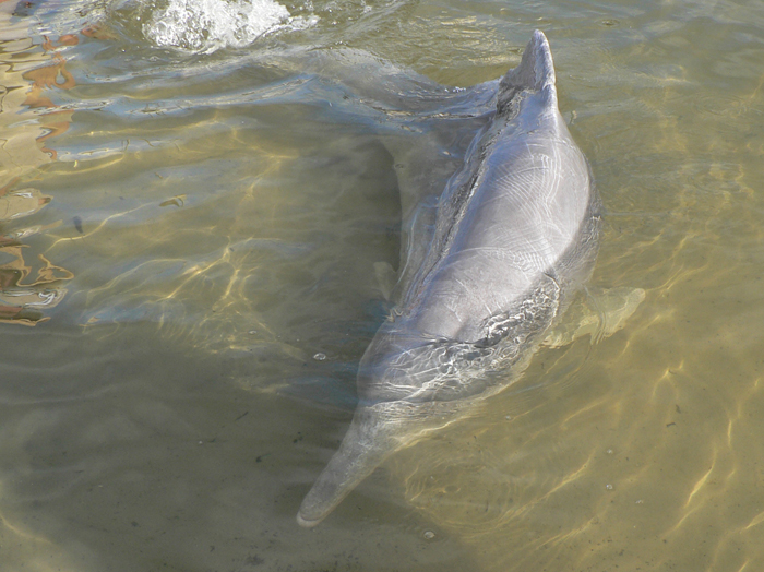 Le lendemain dès 8h nous étions à l'embarcadère où évoluaient deux dauphins, sous les yeux d'une douzaine de personnes, surveillées par une "volunteer" qui s'assurait qu'on les traitait bien et en particulier qu'on ne les caressait pas, de crainte de leur communiquer des virus. Elle notait un tas d'observations dont la quantité de poissons qu'on leur donnait.