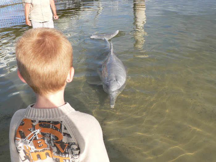 En 2008 nous avons voulu montrer les dauphins à notre petit garçon. Des panneaux publicitaires placés sur l'highway rabattaient les voyageurs, quatre "volunteers" montaient la garde, un dauphin tournait devant ce monde. Rien ne se passait, il fallait attendre le bateau avec des spectateurs venus de l'autre côté de la baie avant de leur donner à manger. Puis le volunteer en chef, tout imbu de son rôle pédagogique nous a infligé 10 minutes de baratin sur les dauphins. On eut enfin le feu vert pour ... se passer les patounes dans une solution antiseptique, acheter un poisson à condition de jouer des coudes et qu'il en r