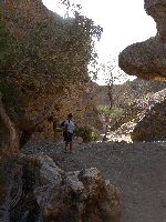 L 7/11 Nous voici à Sesriem. Le camp est plein, nous avons droit au camping annexe, sans ombre et bien en face du groupe électrogène. Nous allons au canyon de Sesriem profond des ses, non six longueurs de courroie soit 30m. La rivière Tsauchab l'a creusé. Qu'on est bien au frais au fond, nous remontons le canyon jusqu'à ce qu'une mare boueuse nous barre le chemin et nous laissons un groupe partir en balade vers le sud. Trop chaud pour nous.
