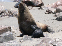 S 5/11 On fonce vers Henties Bay sur la côte des squelettes. Beau temps un peu frais à cause de l'océan. Nous atteignons Cape Cross et ses colonies d'otaries à fourrure. Il y en a des centaines, bruyantes et malodorantes. Des mères allaitent leurs petits, de gros mâles se prélassent au soleil. Et des chacals rôdent repérant des nouveaux nés égarés ou dont la mère est à la pêche. Nous en verrons deux disparaître dans l'intestin de ces prédateurs. Juste au dessus de la plage une croix marque le point du premier débarquement en Namibie. Nous gagnons Swapokopmund avec ses monuments allemands. Nous y achetons, dans une boutique des sculptures en bois dont une splendide girafe de plus d'un mètre qui trône maintenant dans notre salon. Prix particulièrement intéressant.