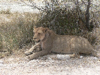 24/10 Toute la journée nous sillonnerons Etosha, observant les animaux. Un gros éléphant broute au loin, bien tranquillement le long d'une rivière à sec. Il rejoindra un petit point d'eau qu'il s' appliquera à transformer en mare de boue dont il va s' asperger longuement. A droite un troupeau de zèbres reste à distance quand soudain l'un deux donne l' alerte. Une lionne se faufile dans les herbes, apparaissant puis disparaissant. Sans le cri des zèbres nous ne l'aurions pas remarquée. Nous pensons qu'elle va traverser la route pour aller au point d'eau mais rien. Finalement nous trouverons six lionnes à l'ombre de buissons. A 10 mètres on ne les voyait pas, à 4m on n'en voyait qu'une. Cette petite troupe allait passer les heures les plus chaudes à l'ombre. Une photo prise à moins de 4 mètres , fenêtre ouverte, grosse sensation. Notre repas est pris dans un enclos où l'on peut descendre de voiture. Ça fait du bien de se dégourdir les jambes mais on est contents, dans cet univers de hautes herbes, d'avoir refermé la porte de l'enclos sans voir surgir un fauve.