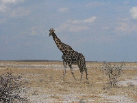 Voici l'entrée d'Etosha, inscription à l'entrée auprès d'une ranger à moitié endormie (il faut pouvoir s'assurer, à la sortie que vous avez payé toutes les nuitées). Après quelques centaines de mètres dans Etosha nous voyons notre première girafe, majestueuse. Sa tête dépasse des arbres qu 'elle broute, puis des springboks, steinboks. Arrivée au camp de Okakuejo et premier arrêt devant le point d'eau pour observer une troupe de zèbres qui s'abreuvent. Nous nous installons rapidement au bout du camp. Nous repartons au point d'observation. Ce sera un festival : troupes d'éléphants, de zèbres, de springboks, des phacochères, puis un face à face éléphants rhinocéros. Plus tard des lions et des hyènes. Et nous avons dormi, bercés par les barrissements des éléphants et les feulements des lions. Un excellent moment.