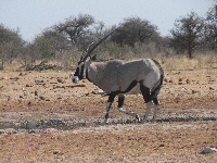 M 25/10 Nous explorons la partie est d'Etosha. Beaucoup d'herbivores: bubales, élands, girafes, gnous, oryx, ainsi que des autruches, vautours, marabouts.... Nous passons en sous-bois, les arbres sont massacrés. C'est l'indice du passage des éléphants, confirmé par la présence de leurs énormes déjections. Une famille est là, sous des arbres, elle passera ensuite derrière notre camion avec ses tout-petits. A quelques centaines de mètres nous avons cru percevoir un léger mouvement. Marche arrière, des lionnes dorment sous un arbre, certaines sur le dos avec une patte mollement appuyée sur une branche. Nous les retrouverons une heure plus tard un peu plus éveillés. Les points d'eau du nord sont souvent très fréquentés, jusqu'à plus d'une centaine de bêtes. Nous passerons la nuit au camp de Namutoni dans lequel se promenaient phacochères et Suricates. Par contre peu de vie au point d'eau où nous n'observerons qu'une troupe d'éléphants qui vient se baigner et manger des roseaux mais quelle impression quand un grand mâle vient vers vous vous expliquer que vous êtes seulement tolérés.