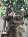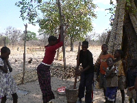 V 28/10 Visite du Mudumu national park. En voulant visiter le village de Lizauli ,ous sommes victimes d'un supercherie sympathique. Un panneau très approximatif (on dit cela après) nous indique le village que nous visiterons sous la conduite d'un gamin de 16 ans, l'aîné de tous les marmots qui nous entourent gentiment. Les parents sont aux champs et les ainés gardent les petits qui eux mêmes s'occupent des tout petits (un gamin de 5 ans peut porter son frère de 2ans). On voit comment on construit une hutte, comment on pile le mil. Ces gens ne possèdent que leur case et quelques ustensiles vraiment de base. Mais la visite est trop vite faite et nous rendons compte que ce panneau sommaire est là pour capter le touriste et que nous ne sommes pas au vrai village..Déçus, nous décidons de nous reposer à la piscine du camp. Un hippo nous tirera de nos réveries. Notre intention initiale, en allant dans la bande de Caprivi était de passer au Botswana et d'y visiter le parc de Chobé mais nous renonçons à ce périple qui nécessiterait encore bien de la route.