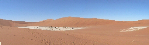 Nous voici au second parking : départ à pied pour le Vlei. Nous marchons au milieu des dunes et voici le vlei, cuvette asséchée recouverte d'une croûte de sel. Un arbre mort donne un impression supplémentaire de désert. Pendant le retour nous nous ensablons : un conducteur local nous nous desensable en 10 secondes. Petit commentaire si vous souhaitez faire la Namibie en voyage organisé : intéressez vous au mode de transport. Nous avons vu des touristes harassés dans des bétaillères. A l'arrivée au camp le soir pas des visages fermés, pas d'entrain. C'est un tel groupe de 18 personnes qui a fait les derniers kilomètres de piste sablonneuse sur le pick-up d'un 4x4!
