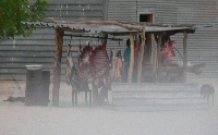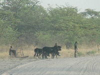 s 29/10 Retour vers le nord ouest via Etosha. La piste qui nous ramène vers katima Mulilo est très poussiéreuse. Même en ralentissant nous ne pouvons éviter de soulever un énorme nuage de poussière d'autant plus gênant que c'est l'heure de la corvée d'eau (il y en a manifestement une autre le soir). Beaucoup de gens convergent vers des points d'eau situés parfois à plusieurs kilomètres. Les récipients vont du simple pot à des fûts placés sur un traineau de bois que tirent deux boeufs, signe évident de richesse. A katima Mulilo une boucherie de plein air est installée au bord de la route. Pas de réfrigérateur ni de protection contre la poussière et les insectes.