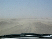 J 4/11 Nous faisons le plein à la station service installée en plein désert et partons pour la côte des squelettes via Twyfelfontein. Nous escaladons le site rupestre avec un guide, il commence à faire chaud. Un petit rafraîchissement, un repas dans un lodge situé pas loin. Ce lodge, parfaitement intégré dans le paysage est un exemple de ces lodges luxueux ou même très luxueux qui existent en Namibie. Nous nous remettons en route pour la côte des squelettes. Nous atteignons la porte du parc du Nabib Naikluft et nous enregistrons (ce n'est pas donné). Le désert est beau, quelques animaux par ci par là et enfin les premières welwitchias. Ces plantes grasses survivent, véritables fossiles survivent dans le désert. Nous continuons vers la côte mais le sable commence à voler au travers de la route, le brouillard apparaît. Ce brouillard est une condensation de l'air humide et froid de la mer. On n'y voit plus très loin. Nous atteignons enfin la route qui longe la cote et qui mène à Swakopmund. Mais la visibilité est vraiment trop faible. Petit moment d'inquiétude, ne risquons nous pas le sandblast, vent chargé de sable qui vous décape les voitures jusqu'à la tôle et qui dépolit les vitres? Ces risques ne sont pas assurés. Inquiets nous faisons demi tour et décidons d'aller à Swapkopmund par l'intérieur des terres. Nous passons la nuit à Khorixas où il fait plutôt froid (ça vaut aussi pour l'accueil).