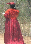 L31/10 Départ pour Opuwo, étape avant les chutes d'Epupa. L'arrivée dans cette ville a été un moment surprenant. Enorme fréquentation à la grande station service : des femmes himbas à la peau enduite de terre rouge et ne portant qu'un semblant de pagne en peau de chèvre côtoyaient des femmes hereros vêtues de longues robes de couleur avec jupons. Tout ce petit monde voulait nous vendre des produits (colliers, bracelets, fruits, ...). Surprise par les cheveux blonds et lisses de ma femme , une petite herero les lui a caressés. Nous avons passé la nuit dans un camping communautaire aussi sympathique que vide.